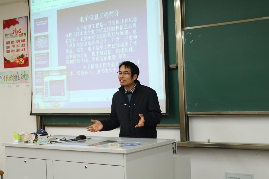 为了让电子信息类专业的学生确切了解将来的专业分流,2017年11月21日下午3点在6-107举行了始业教育之专业思想教育讲座。齐鸣鸣、张祎江、蔡尚真三位老师分别对网络工程、计算机科学与技术、电子信息工程三个专业进行讲解,也不忘对同学们的大学生活提醒几句,关心之情溢于言表。