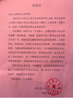 在奉献与服务的土壤里,播撒一颗关爱的种子,收获温暖与希望的花朵,与社会共同编织一幅和谐美好的画卷。班级成员深知自己肩上的责任,在各大志愿活动和社会实践活动中积极参与,用行动证明与社会同心,助人乐己的决心。陈郑天同学利用暑期参加志愿者活动,不怕苦不怕累,作为新时代的青年,彰显担当,受到象山县公安局定山派出所的高度赞扬。陈雪芳等多名同学均被评为“社会实践先进个人”。