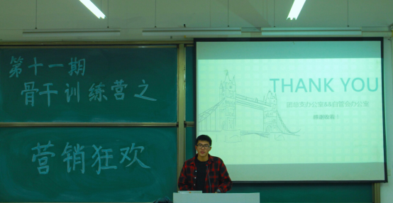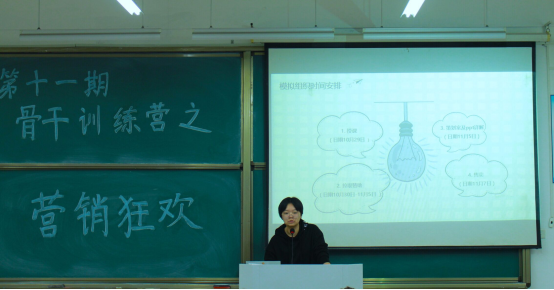 课上,首先进行授课讲解的是自管办办公室部长陈斯琦,她对模拟组织介绍、策划案详解、赞助物品须知三个方面进行了简易的介绍,她轻快的语言使在场的同学明白骨干训练营的时间安排与流程,并提高了同学们对骨干训练营之营销狂欢的认识。