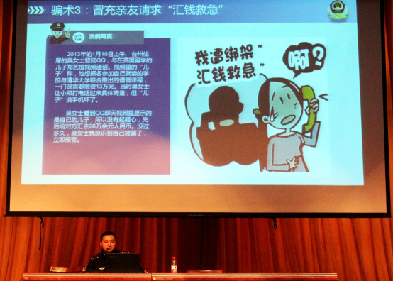 今天讲座中越城区公安局的工作人员为我们介绍了一下常见的骗术冒充亲友请求“汇钱救急”:冒充公检法调查,内部指标,低分高录, 通讯(网络)诈骗,新型兼职诈骗,征婚交友,引诱误导信息,虚假信息诈骗,搜出来的诈骗陷阱,等等。