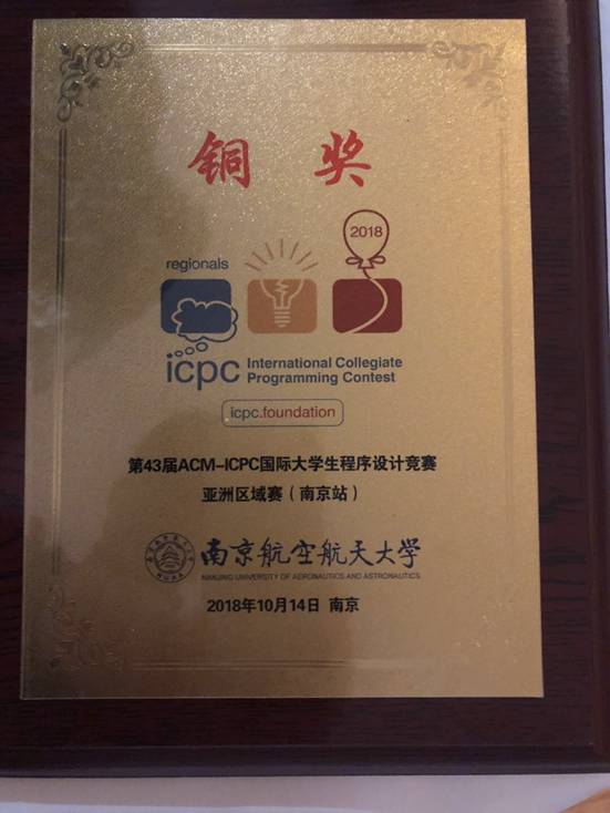 第 43 届 ACM-ICPC 国际大学生程序设计竞赛亚洲区域赛(南京)现场赛于 2018 年 10 月 13-14 日在南京航空航天大学举行。信息与机电工程分院蔡尚真老师指导,电子信息工程1501班金亮、计算机1602班周泽成、计算机1602班陈军组成的“哈士奇与扫雷王者”队伍参加了区域赛,该队凭借扎实的凭借着扎实的编程功底、默契的团队合作在激烈的比赛中脱颖而出,赢得一枚铜牌,这是我院首次在ACM-ICPC国际大学生程序设计中获奖,实现了历史性突破。本次比赛共有来自中国大陆和香港地区的 184 所高校的 332 支参赛队伍同场竞技。