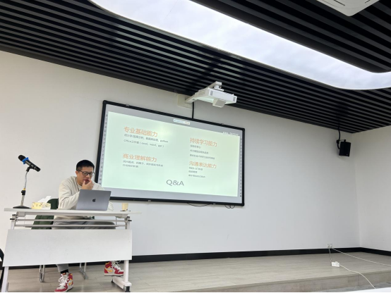 讲座中,江工结合自身工作经验,为同学们介绍了电商业务系统中大数据相关的岗位价值和要求,数据分析的产出,数据产品在商业领域的典型应用,就数据分析师、数据仓库工程师、数据科学工程师、数据产品经理的业务内容、要求等进行了详细的介绍,并就同学们专业学习给出了自己的建议。他指出,同学们在后续的学习中,要注重专业深度的沉淀,培养良好的跨界复合能力、商业理解能力、沟通能力,以及学习能力。讲座最后,同学们和江工就开发能力学习、就业抉择等等进行了充分的互动。