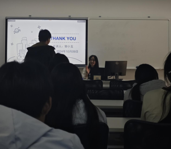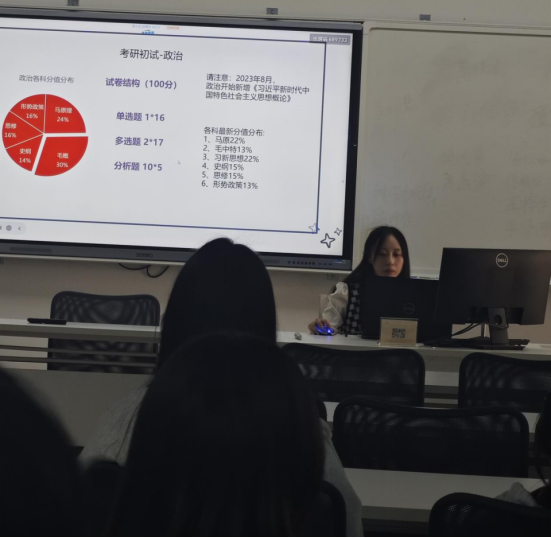 讲座中,邹小玉同学就考研现状、考研科目情况,学习经验等情况进行了详细的分析,就如何择校、如何备考等进行了详细的介绍。邹小玉同学认为坚持和努力是考研的秘诀,提醒同学们可以时刻关注研招网和学校官网,要清楚自己的能力,按照自己的节奏学习。最后邹小玉同学还就现阶段如何安排学习、如何看待竞赛、课外活动等问题和同学们进行了充分的交流。