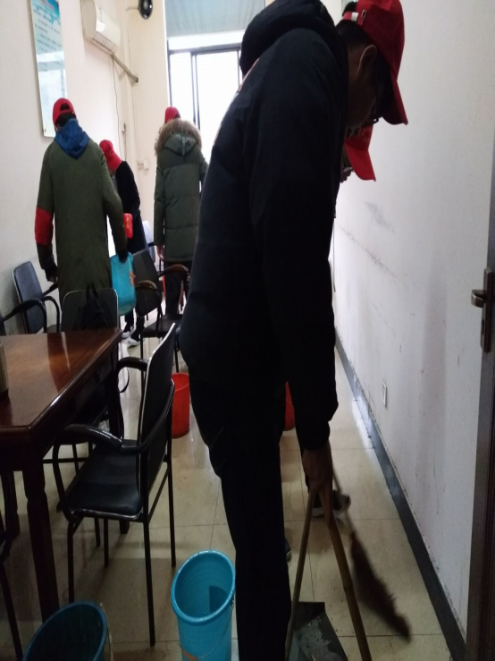 气温的骤降,天气的寒冷,给了义工们一个考验,大家都穿上了厚厚的羽绒服,就算是这样,也不能影响义工们热情的高涨,做起工作来一点儿不含糊。零下的天气,水冰凉冰凉的,洗抹布时将手浸在冰冷的水中,一遍又一遍,手冻的通红,脸颊被风吹得冰凉,可就算是这样,义工们也坚持完成了他们的工作,从里到外,从扫地到拖地,没有人缩着身子,没有人逃避工作,义工们的精神,着实让人敬佩。