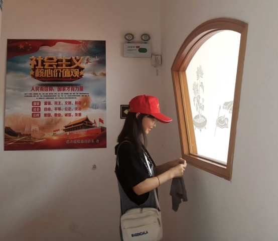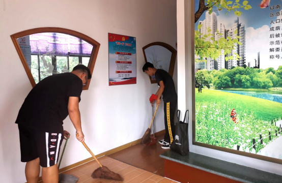 在照料中心阿姨介绍大致情况后,队长迅速分配好任务,以6人为一组,分别进行1、2楼的清扫工作。一声令下,志愿者小队立刻分散前往自己的位置。鲜红的帽子上下飞舞,宛如一个个勤劳的红色精灵。他们时而在窗边,时而在桌旁,时而弯下腰,时而靠着墙。汗水渗透了鬓发,想带着眼镜滑下鼻梁,却总被无情的擦在袖口,冷落一旁,换来的是更加高昂的热情。