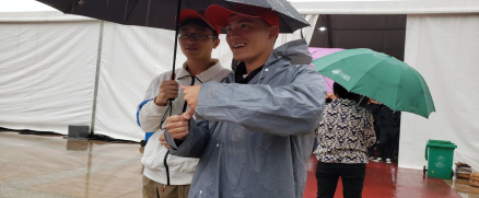 到达城市广场后,天气依然下着小雨,丝毫没有转晴。为了能用手语把更多的精彩带入无声世界,手语老师不顾风雨站在台上为义工们教学。